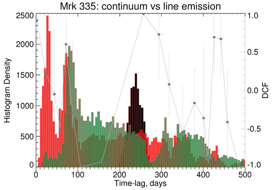Time delay analysis of the broad line emission relative to the variable continuum flux for Mrk 335. The coloured histograms and labels are the same as in Figure 4.