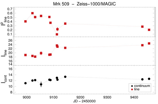 Mrk 509 light curves obtained with MAGIC. From top to bottom: polarized broad line flux and integral broad line flux with subtracted continuum and integral continuum flux . Fluxes are given in mJy.