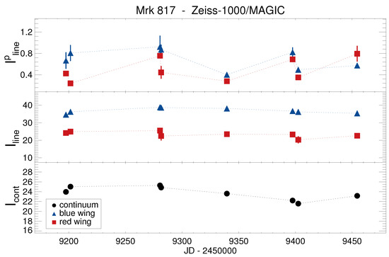 Mrk 817 light curves obtained with MAGIC. From top to bottom: polarized broad line flux and integral broad line flux with subtracted continuum and integral continuum flux . Red and blue dots in and light curves denote the fluxes of the “red” and “blue” broad line profile wings, respectively. Fluxes are given in mJy.