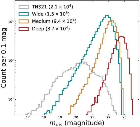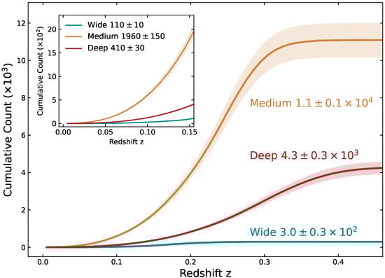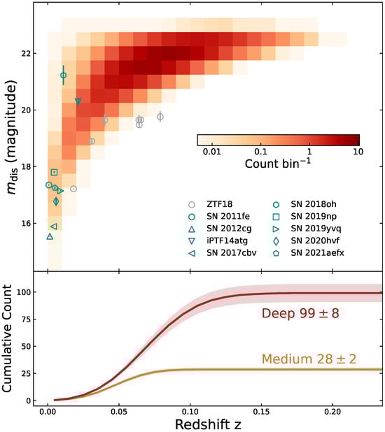 We define “early phase SNe Ia” as less than two days since the explosion. Note that is determined by the second observation, thus early phase SNe Ia cannot be “discovered” by the Wide mode. The upper panel of Figure 3 displays the distribution of discovered early phase SNe Ia by the hypothesized Deep mode in the space of versus redshift z. Compared with the discovered SNe Ia with early phase observations from ZTF or other studies [18,19,22,23,24,25,26,27,28,42], the WFST can find much more early phase SNe Ia with higher redshift and fainter brightness. Thus, the Deep observation with the WFST would contribute a substantial sample of SNe Ia with early phase photometric data. In comparison, the cumulative count of discovered early phase SNe Ia by the hypothesized Medium mode is also displayed in the lower panel of Figure 3, which is less than that of the Deep mode. However, catching the signals of early phase SNe Ia is the first step, and the consequent efforts are also necessary, such as rapid follow-up observations by other facilities.