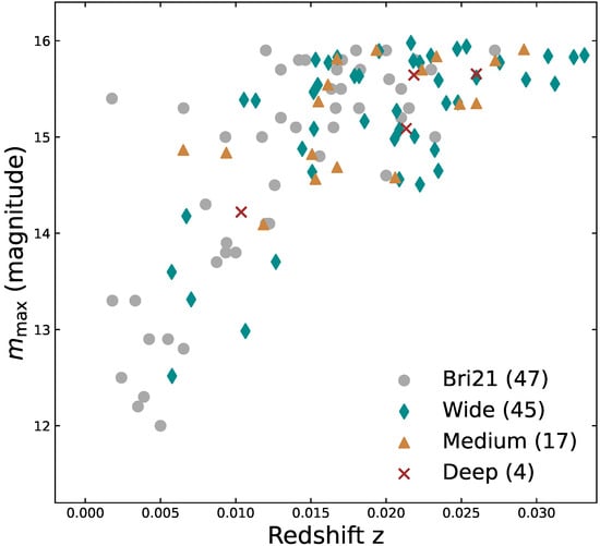 The distributions of the maximum magnitude () versus redshift z for the bright SNe Ia defined as maximum magnitude brighter than 16.0 mag. The gray symbols are bright SNe Ia discovered in 2021 (Bri21); the rest are the selected bright SNe Ia discovered by the WFST under the three mock observations. The total numbers of bright SNe Ia are displayed in the figure legend.