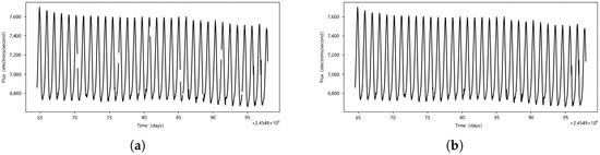Each light curve in the dataset comprises 1639 time points, including 15 temporal gaps. As these gaps are all within one cycle, directly deleting them does not have a significant impact on the light curve. The processed light curve, as illustrated in Figure 1b, maintains its integrity. This preprocessing ensures that the light curves are ready for effective use in the neural networks.
