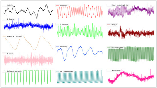 Examples of light curves in the Activity, Cephei, Classical Cepheids, Scuti, Eclipsing variables, Ellipsoida, Doradus, Rotating, RR Lyrae type AB, RR Lyrae type C, RVTauri, Slowly pulsating B star, and Semiregular classes selected in the training set, respectively.