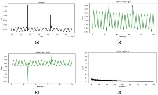 (a) The light curve after removing the temporal gaps. (b) Low-frequency image generated by the wavelet transform. (c) High-frequency images generated by wavelet transform. (d) Spectral image generated by Fourier transform.