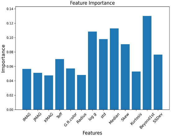 The higher classification accuracy can be obtained by using features that contain more information about the light curves [16,20]. In addition to the frequency features, the standard deviation of the flux and median of the flux are calculated. It is noteworthy that these statistical features exhibited variations across different types of variable stars. For instance, pulsars typically exhibited prominent peaks, while RR-type variables are smoother. And, the Kepler photometry features, effective surface temperature, stellar radius, etc., are also used. These supplementary features provided valuable contextual information, aiding in the differentiation of various types of variable stars. Table 2 lists the features that are filtered out to help with the classification. The importance of features are calculated using the random forest algorithm, as shown in Figure 5.