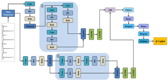 Then, the features from the two branches are fused and passed through multiple dense layers. These dense layers allow for non-linear transformations that facilitate the extraction of correlations between different features, by connecting neurons to all activations of the previous layers. Finally, the softmax layer is used for classification and recognition. The softmax function calculates the predicted probability of each category based on the fused features obtained from the dense layer. This, in turn, determines the class of each light curve.