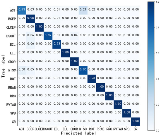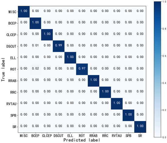 Among the merged light curves, the clustering centers between ECL and BCEP are the farthest apart, resulting in the largest clustering range and significant differences between the two categories. The confusion matrix of the classification results is shown in Figure 13a, where BCEP can be recognized well. However, some light curves of the ECL overlap with BCEP, leading to inaccurate recognition of ECL.