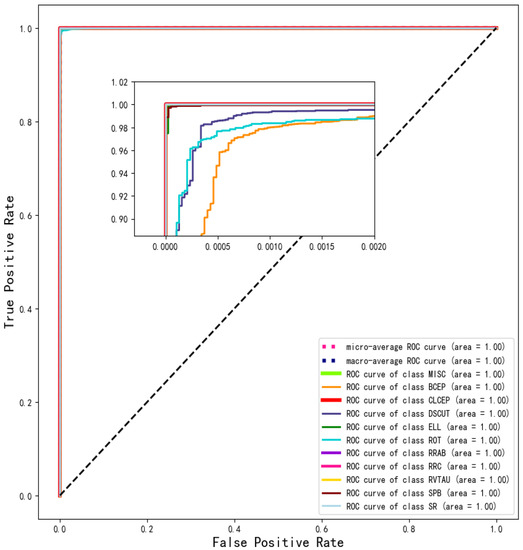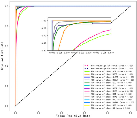 ROC curve of each type. Each curve represents a category, and the values in brackets represent the area under the ROC curve (AUC). Macro-average curves and micro-average curves representing all categories were also drawn. The dotted line represents the “random opportunity” curve.