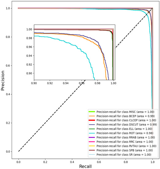 In the case of data imbalance, the PR curve (precision recall) serves as a complementary metric to the ROC curve, displaying a more variable shape. The PR curve is constructed with recall on the horizontal axis and precision on the vertical axis. The performance of the model’s classification can be assessed by measuring the area (AP) between the PR curve and the axes, as described in Equation (6). The larger the AP, the better the classification performance. The PR curve for the classification result is displayed in Figure 10.