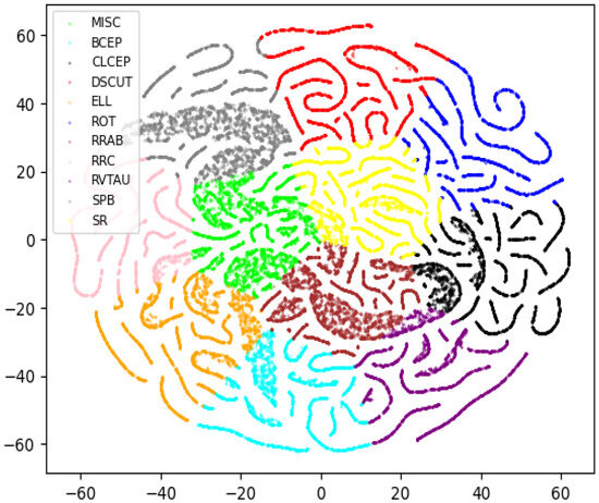 The 2D t-SNE is shown in Figure 11, where each point is a light curve. The visualisation results show a very high differentiability between the categories, with clear boundaries between the light curves of the different categories. The 2D t-SNE image of the light curve shows the reasonableness of the classification according to the 11 categories in Table 1.