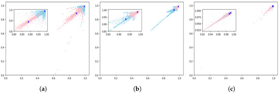 Clustering results between the merging categories, with different colors representing different categories and the blue crosses × are the clustering centers. (a) ECL and BCEP. (b) DSCUT and GDOR. (c) ACT and MISC.