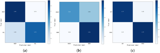 Normalization confusion matrix using RLNet in the merging categories. (a) ECL and BCEP. (b) DSCUT and GDOR. (c) ACT and MISC. The closer the diagonal value is to 1, the better the classification performance. The values in the plot are rounded to two decimal places.