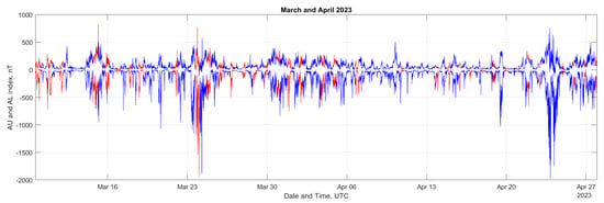 Auroral Electrojet indices AL and AU. Time intervals when the spectrometer made measurements are highlighted in red.