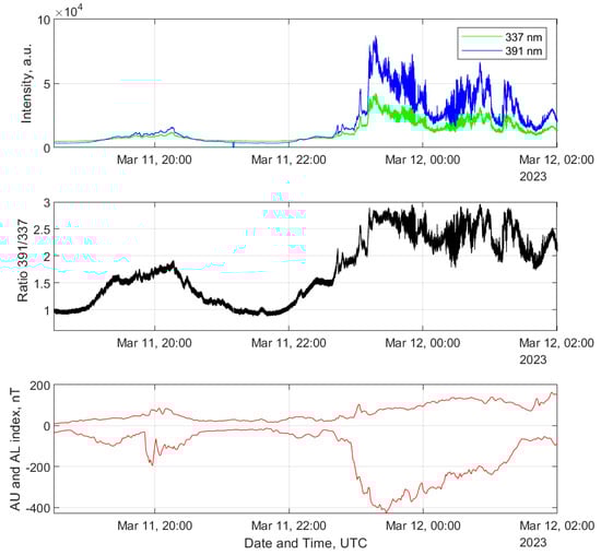 11 March 2023 event overview. Upper panel: 337 nm (blue line) and 391 nm (green line) channels’ lightcurves. Middle panel: time dependence of . Bottom panel: AU and AL geomagnetic activity indices.