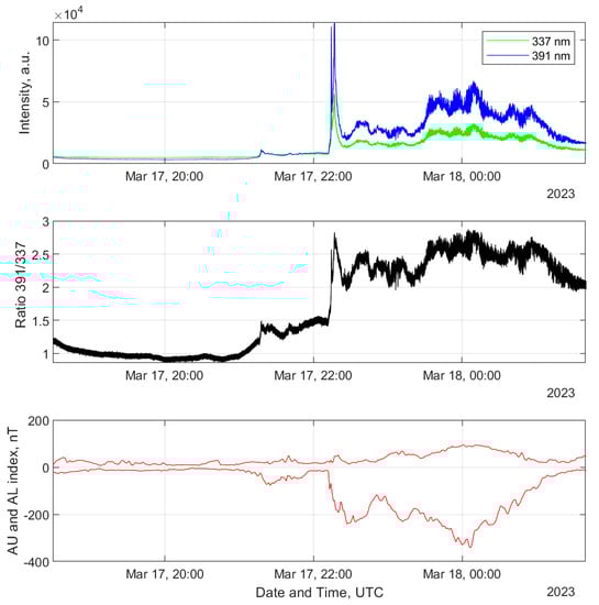 17 March 2023 event overview. Upper panel: 337 and 391 nm channels’ lightcurves. Middle panel: time dependence of . Bottom panel: AU and AL geomagnetic activity indices.