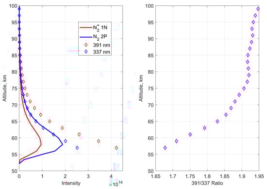 Left panel: Optical emission profiles for and band systems from [] (solid lines) and calculated intensities of 391 nm and 337 nm lines at the entrance pupil (rhombus markers). Right panel: obtained from optical emission altitude profile simulations.