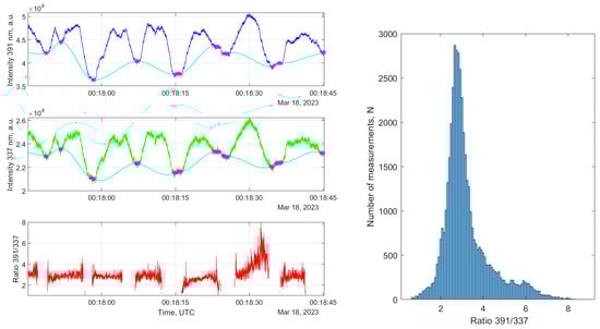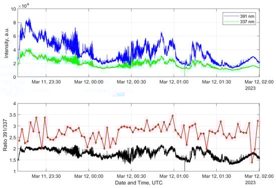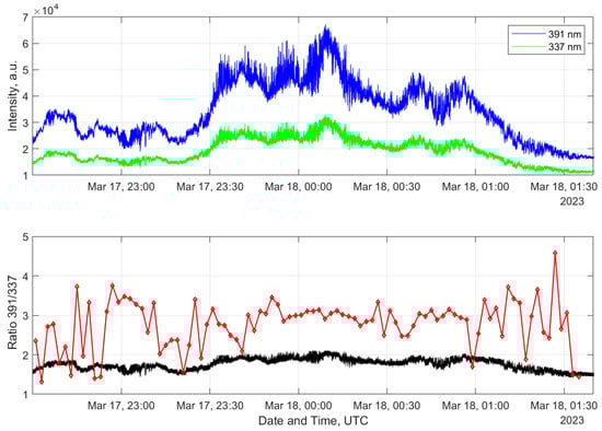 Upper panel: intensities of 391 nm (blue line) and 337 nm (green line) channel during the event 17/18 March 2023. Bottom panel: calculated as a simple ratio of intensities (black line) and obtained using the procedure described above (red line).