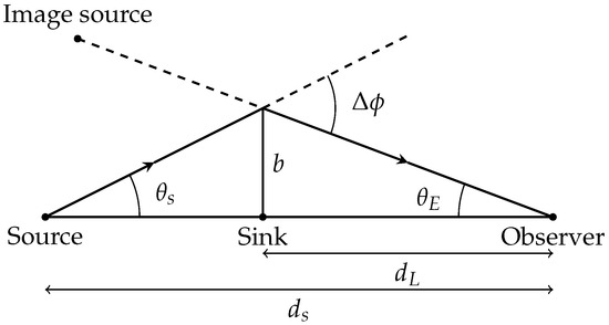 In the proposed scenario of photonic BECs, the sink size is much smaller than the distance between the source, the particle sink, and the observer, which leads the particle sink to behave as a thin analogue gravitational lens for the phonons. From Equation (25), it can be seen that, for a certain satisfying , the Einstein angle depends only on the dissipating parameter . Comparing this to the case of a Schwarzschild black hole, the parameter clearly plays the same role as the black hole mass [38].