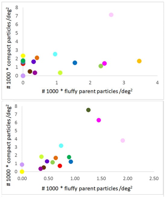 Relation between compact particles and fluffy parent particles before (top) and after (bottom) the application of the traceback algorithm (the number of compact and fluffy parent particles has been multiplied by 1000 for a better representation). Each dot corresponds to a different geomorphological region (for interpretation of colors, refer to []. Before the application of the traceback (top), a dust particle has been assigned to a specific region by projecting the spacecraft position on the surface. No correlation is found in the coma (top), while the two dust populations are correlated on the nucleus surface (bottom).