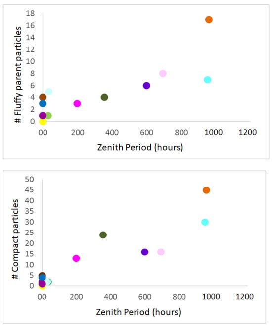 Number of parent fluffy (top) and compact (bottom) dust particles as a function of the numbers of hours spent under normal solar illumination. Each dot corresponds to a different geomorphological region (for interpretation of colors, refer to []). Before the application of the traceback (top), a dust particle has been assigned to a specific region by projecting the spacecraft position on the surface. A correlation between dust ejection and solar illumination is found.