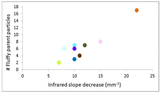 Number of fluffy parent particles ejected from each region as a function of the variation in the infrared slope. Each dot corresponds to a different geomorphological region (for interpretation of colors, refer to []). A larger slope variation indicates a higher flattening. The correlation between the two indicators reveals that higher dust ejection is related to larger water ice exposure, i.e., ice-rich terrains are more active. The same behavior is observed by considering other GIADA (i.e., ejection rate of compact particles) and VIRTIS (i.e., 3.2 μm band center shift) indicators.