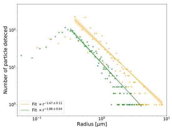 MIDAS particle size distributions with radii based on the 2D projection combined with a power law a·rb fit with an index b of ∼−1.67 ± 0.11 (yellow line) and the one derived from volume with an index b of ∼−1.88 ± 0.04 (green line).