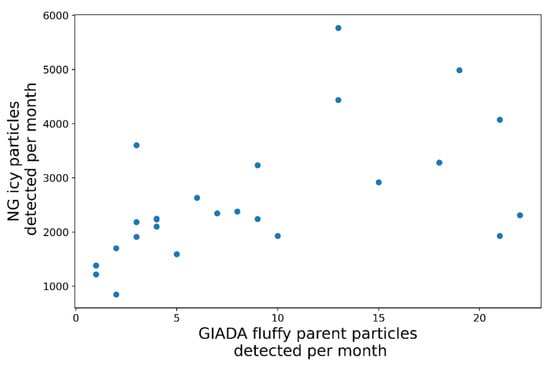 Relation between icy particles detected by the ROSINA-COPS’s nude gauge (NG) and the fluffy parent particles detected by GIADA-GDS. Each dot refers to a different month of the Rosetta mission. A moderate correlation arises.