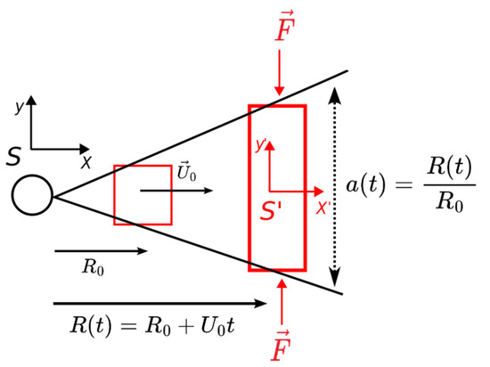 Velli et al. [30] proposed and developed the Expanding Box Model (EBM), which allows for the study of plasma expansion in a new system of reference. The main idea of this model came as an answer to the limited memory in computer simulations when studying solar wind plasma expansion. It enables the study of the radial–spherical expansion through a Cartesian approximation with a non-trivial change of coordinates. In this context, consider a plasma parcel expanding in a static and inertial system of reference S. The EBM defines a new system of reference co-moving with the plasma at constant velocity. In this new framework, through the change of coordinates, the plasma parcel becomes steady (non-expanding) and is moving along with it. For instance, from the S system, an observer will see the plasma expanding and going away, while from the new system, the observer will move along with the parcel but will not notice the expansion (i.e., the volume of the plasma parcel/box is constant). The question that arises is how the expansion can be described in a non-expanding frame. Within this new description, the expansion is no longer a spatial property of the system. When transforming to the new frame, the expansion traduces in temporal variations rather than spatial. This idea has the computational advantage of studying the expansion in a co-moving and non-expanding framework. Also, this way, we can expect to reduce computational memory limitations in specific studies of plasma expansion. On the other hand, the EBM has analytical advantages, as we can rewrite equations using this formalism with an explicit dependence on the expanding parameters.
