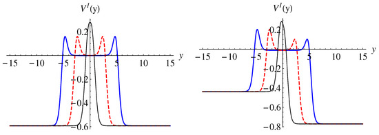 The shapes of the background scalar potential for the symmetric (, (left)) and asymmetric (, (right)) degenerate I Bloch branes with . The parameters are set to , for the thick blue lines, for the dashed red lines, and for the thin black lines.