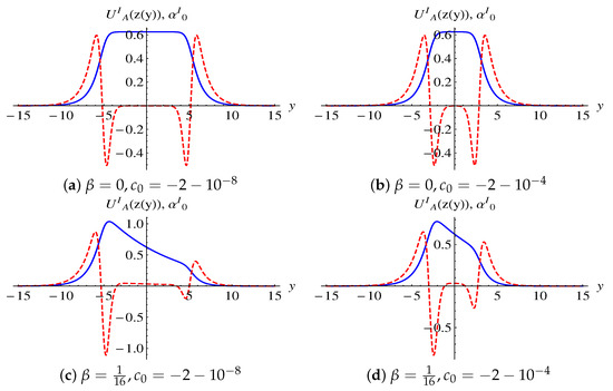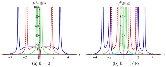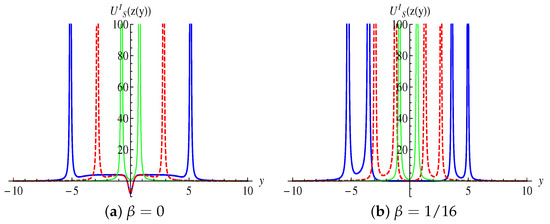 Since the expressions of effective potential are very complex after substituting the asymmetry degenerate Bloch brane solutions into Equation (60), here we only display the profile of with different parameters (see Figure 7 and Figure 8). It is clear that the effective potential is an infinite single well such as for the symmetric degenerate I and II Bloch solutions, while for the asymmetric degenerate Bloch solutions , there are infinite wells when (asymmetry degenerate I Bloch) or (asymmetry degenerate II Bloch). Therefore, there is a zero mode and a set of massive KK modes for the scalar , which can be obtained by solving Equation (59) numerically. Then, substituting the KK modes into the coupling equations of scalar degrees, we can also obtain the KK modes of the scalar field , which do not hold up in the following.