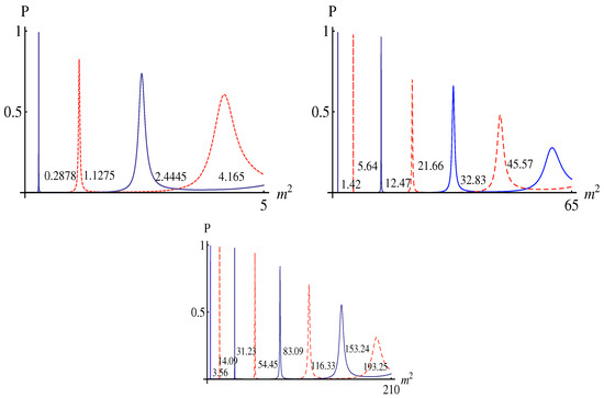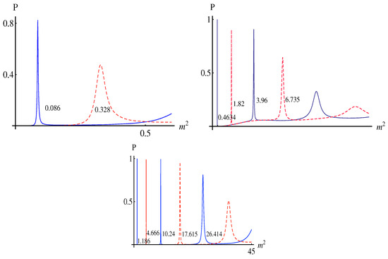 The behavior of the potentials depend on the parameter (or ). When , two subwells appear at the locations of the two corresponding sub-branes, which could be related to the resonances. And the resonances may remarkably affect the modifications of the four-dimensional Clumb’s law at distances. In what follows, we investigate the massive modes of the vector field by numerically solving Equation (31) with the effective potentials (40) and (41). In Refs. [31,32], the relative probability method was introduced to investigate the resonance of matter fields for the symmetry effective potential. The relative probability function is of , which is defined in a box with borders at :