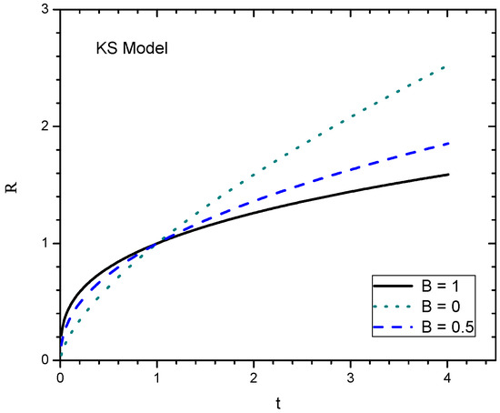 The anisotropy parameter has zero value whereas the deceleration parameter has value Here, in Figure 1, the evolution of the scale factor within the KS model is given for the three choices of the MCG parameter B. The parameter space used for plotting the figure include , , . The present epoch is considered as . It is observed that the stiffness in the scale factor depends on the choice of the parameter B. While in initial epochs, the scale factor appears to be more stiff for a higher value of B; in a future epoch, the behaviour is the reverse, i.e., a lower value in B leads to a stiffer scale factor.