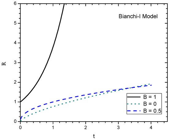 It can be observed that, for the BI universe as well, the solutions for the volume and scale factors depend on the MCG parameters , A and B and, as such, the dependence on the B-parameter is substantial. Here, also, we consider the three different values of the parameter B to assess its effect on the exact solutions.