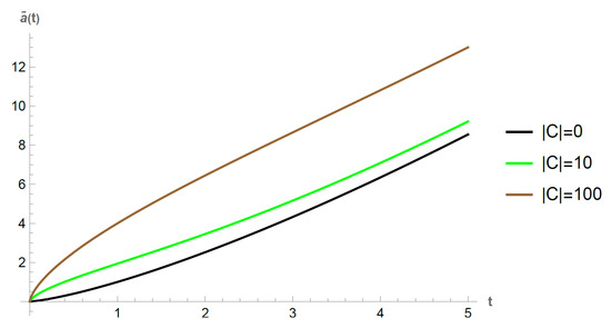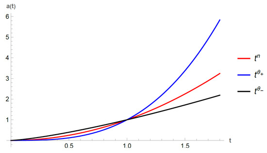 Thus, for negative powers of in F, we have, in the Einstein frame, a more rapidly expanding universe than in the Jordan frame for . On the contrary, for positive powers, we have a slower-expanding universe. For small time values , this behaviour is flipped, and the fastest expanding universe corresponds to positive powers of . We show the behaviour just described for in Figure 1.