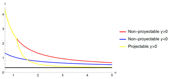 The upper bound acquires its maximum value at and corresponds to approximately . Thus, in the proyectable case, the upper bound on n is more restrictive than in the non-proyectable case, which leads to