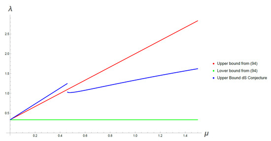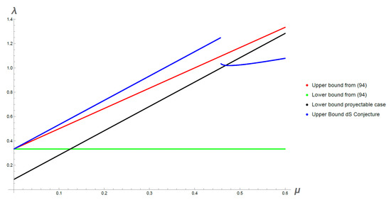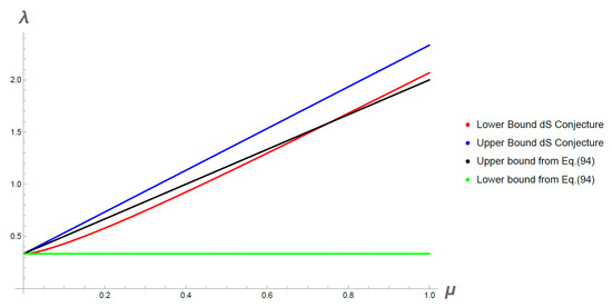 Thus, we obtain an extra inequality that has to be taken at the same time with (94) and (96), but now it is a lower bound for . In Figure 6, we show the bounds shown earlier for (94) and (96), but we now add the bound coming from (106) for and . We note that in order to fulfill the complete system of inequalities, there is an upper bound for , and thus becomes restricted once again to be close to .