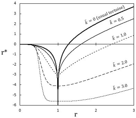 Figure 1. The –tortoise coordinate given by Equation (12) for various values of (with ). - The advanced and retarded Eddington–Finkelstein coordinates are defined asrespectively.