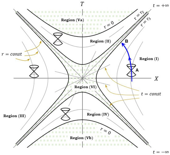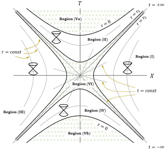 - Regions (III) and (IV) are double copies of Regions (I) and (II) respectively, by flipping the sign of the KS coordinates, viz. . Regions (Va) and (Vb) are unphysical, viz. .