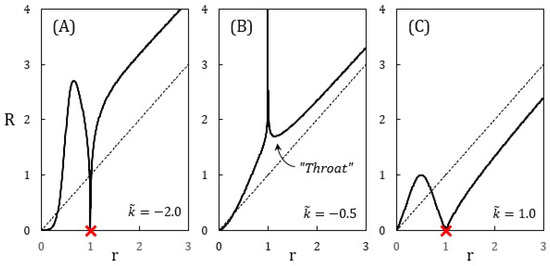 R vs. r for the special Buchdahl-inspired metric; using . Panel (B), representative of , yields a minimum for and corresponds to a wormhole. Panels (A,C), representative of , show a monotonic behavior for in the “exterior”, .