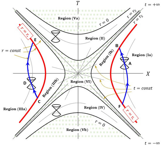 It is essential to note that, according to Equations (20) and (21), each spacetime event with r in the range of corresponds to two antipodal points and of the KS coordinates. This duplication (or double degeneracy) is nothing but a double copy of exterior sheets. However, in general, these two points correspond to distinct spacetime events which occur in two separate sheets. Only along the loci do the sheets become “glued” together, forming a wormhole throat with the two thick red hyperbolic branches as the two mouths. Along the throat, the two antipodal points correspond to the same spacetime event. In other words, in Figure 6, point B and point C are identical, as are points E and F. Note that this identification does not apply, for instance, to the pair of antipodal points A and D, as these points stay off the throat. That is to say, despite sharing the same value of r and the same value of t, point A and point D represent two independent events that take place in two separate spacetime sheets.