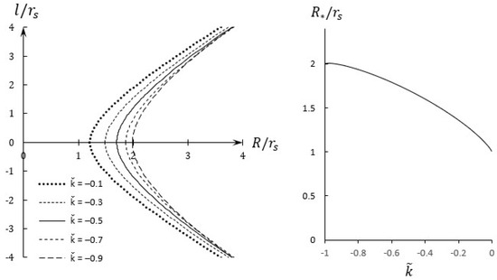 Figure 7 illustrates the proper radial coordinate for various values of within the range . For instance, when , it corresponds to , , , .