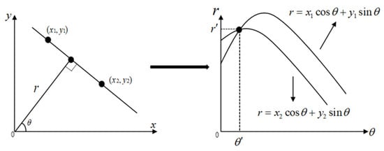 The differenced images are utilized to distinguish the moving objects from the background following image preprocessing. The moving objects appear as straight lines, which can be recognized using HT. Hough transform [24] is based on the concept of mapping a pixel point ( x , y ) from the image space to a sinusoidal curve r = x cos θ + y sin θ of the polar coordinate space ( r , θ ) . The sinusoidal curve represents all possible straight lines passing through that point. Collinear points in the image space are represented by a single point ( r , θ ) at which sinusoidal curves in the polar coordinate space intersect. Straight lines can be detected by evaluating the accumulation value at that point ( r , θ ) in the polar coordinate space, as illustrated in Figure 3. HT can also be applied to detect geometric shapes such as circles, ellipses, and other specific shapes in addition to line detection [25,26].