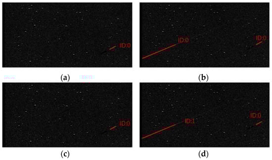 Figure 10. The tracking results of multiple moving objects: (a,b) The tracking results of multiple moving objects by the Reference [22] algorithm; (c,d) The tracking results of multiple moving objects by our proposed algorithm.