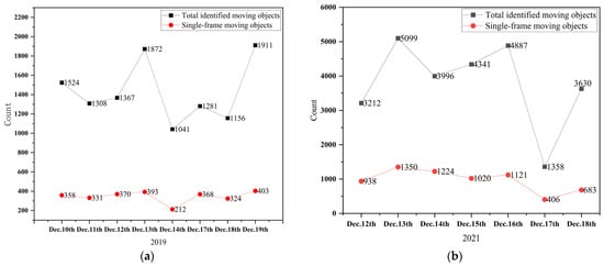 Figure 11. The results of total identified moving objects and single-frame moving objects for each date: (a) in 2019; (b) in 2021.