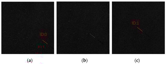 The Reference [] algorithm only considers the tracking of adjacent frames for moving objects. When a moving object appears in adjacent frames and is missed in a certain frame, there is possibility of mistakenly identifying the last frame’s moving object as a single-frame moving object. As shown in Figure 9a–c, when a moving object appears in three adjacent frames, it is labeled as ID:0 in the first frame. If this moving object is not detected in the second frame, resulting in the failed match, the first frame of this moving object is erroneously classified as a single-frame moving object. This, in turn, affects the accuracy of meteor detection. Our proposed algorithm sets the MDF as three times, meaning that object can still be matched with the same object even after disappearing for three frames. As shown in Figure 9d–f, when a moving object appears in the first frame with ID:0 and is matched with the moving object in the second frame, if the second frame doesn’t detect this moving object resulting in a failed match, the position co-ordinates of the moving object from the first frame are retained, and it is considered as one disappearance of the object. Later, when matched with the moving object in the third frame, it is labeled as ID:0, accurately identifying the single-frame moving object. Since it reappears several frames later, we can exclude that this was a meteor.