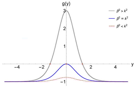 The function defined by Equation (39) for different choices of k and . In particular, the dotted black line denotes the case , and the solid blue line denotes the case , while the dash-dotted red line denotes the case .