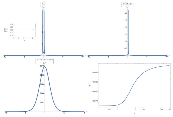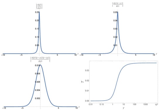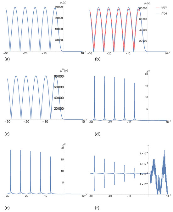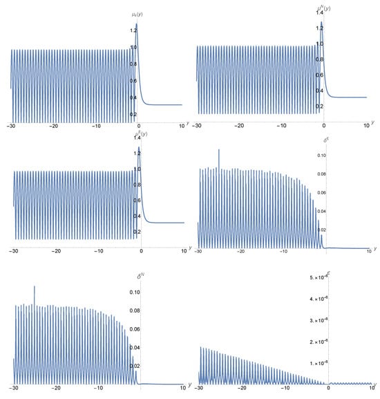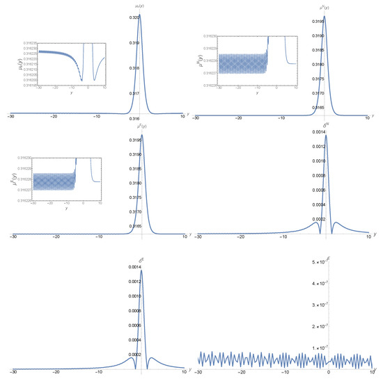 where , denotes the mode function obtained by the UAA method given by Equation (50), is the numerical solution obtained by integrating Equation (7) directly with the same initial conditions, while is the exact solution given by Equation (A7). From these figures, we can see that the maximal errors occur in the region near , but the upper bound is no larger than at any given y, including the region near .