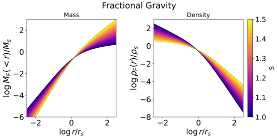 Being a nonlocal framework, in FG the Birkhoff theorem does not hold, but one can insist on writing , in terms of an effective mass ; then, one can differentiate the latter, to obtain an effective density profile . These are actually the mass and density profiles that one would infer by looking at the dynamical observables and interpreting them in terms of Newtonian gravity. We illustrate the effective mass and density profiles for different values of s in Figure 1. With s increasing from unity (Newtonian case), the mass profile steepens and the density profile flattens; in the inner region, a uniform sphere behavior (corresponding to a cored density profile) tends to be progressively enforced.