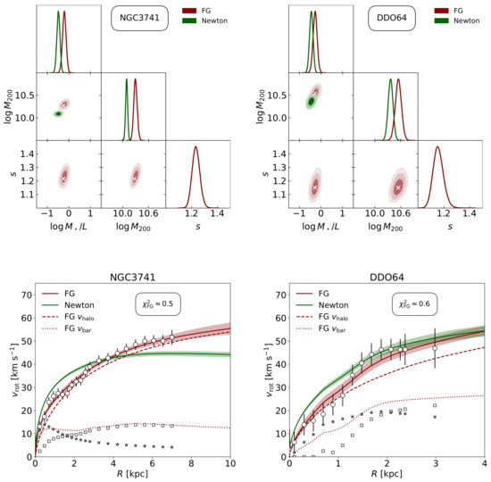 (Top panel): MCMC posterior distributions of the stellar mass-to-light ratio , the DM mass , and the fractional index s for the galaxy NGC3741 (left) and DDO64 (right). The colored contours/lines refer to the standard Newtonian (green) and to the FG framework (red). The contours show 1–2–3 confidence intervals, with the best fit values in FG identified by white crosses. The marginalized distributions are in arbitrary units (normalized to 1 at their maximum value). (Bottom panel): Fits to the rotation curve with the Newtonian (green) and the FG (red) framework for the galaxy NGC3741 (left) and DDO64 (right). The solid lines refer to the total rotation velocity, while (for clarity only in FG) the dashed line highlights the halo contribution and the dotted line the baryonic one. The solid lines illustrate the median, and the shaded areas show the credible interval from sampling the posterior distribution. The value of the reduced of the fit for FG is also reported. The circles represent data from the SPARC database [59] for the total rotation curve, while the contributions from the stellar (for ) and gaseous disks are highlighted by the starred and squared symbols, respectively.