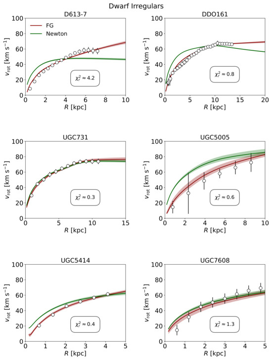 The FG fits were always excellent, and comparable to or better than those in Newtonian gravity. In particular, for D631-7, DDO64, DDO161, UGC5005, UGC5414, and NGC3741, there was a clear preference for FG, both in terms of and of the BIC. In such cases, the fractional index took on typical values , the stellar mass-to-light ratios were slightly larger than for the Newtonian case and more in line with the value around expected from stellar population synthesis models, and the DM masses were appreciably larger, by a few factors, than in the Newtonian fit. In the other cases, namely UGC731 and UGC7608, s was close to 1, the estimates of the fitting parameters in FG and in the Newtonian setting were consistent to within , and the overall quality of the fits was comparable. We looked for some property of these two galaxies that could correlate with their smaller values of s, but were unable to reach a definite conclusion. Potentially interesting evidence came from the kinematics of their HI disks, which appeared asymmetric and disturbed by a past or ongoing gravitational interaction [79]; this could possibly have altered the shape of the outer rotation curve and originated a variant outcome when modeling it in the FG framework. An extended sample of a dwIrr galaxy with a high-quality rotation curve and environmental characterization would be needed, to investigate the issue further, in a statistically sound manner.